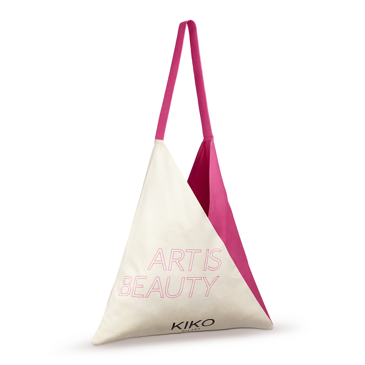 Tote bag en coton. Un modèle unique avec une forme triangulaire irrésistible, ultra-pratique grêce à sa double poignée et à sa grande capacité, et habillé par les imprimés de la collection. Les ingrédients parfaits pour faire de ce sac un indispensable. Vous allez apprécier: -Matériau doux et durable, 100?% coton recyclé. -Très spacieux, il vous permet d’avoir toujours à portée de main vos produits de maquillage et de soin, votre ordinateur portable et bien d’autres choses encore. -Parfait pour être porté à l’épaule en toute occasion, en journée, en voyage ou pour les loisirs. -Des détails splendides aux couleurs vives et un design iconique qui rappelle le Manifeste de la Beauté de KIKO Milano.